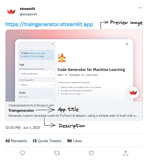 Social media sites generate a card with a title, preview image, and description when you share a link. This feature is called a "share preview." In the same way, when you share a link to a public Streamlit app on social media, a share preview is also generated. Here's an example of a share preview for a public Streamlit app posted on Twitter: